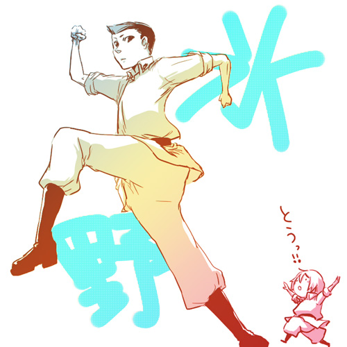 走り出すポーズをとっている手塚に対して、郁は「とう!!」なのです。